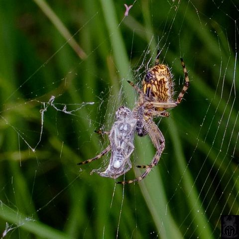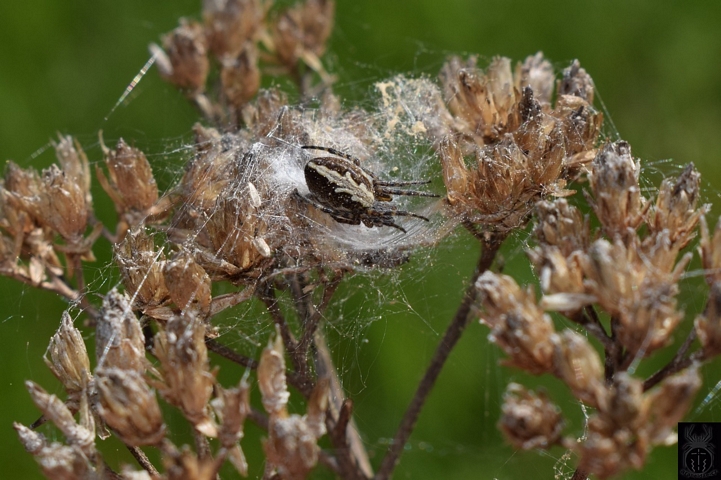 Occurrence: Aculepeira ceropegia is common especially in the meadows, in the fields, sometimes in forest clearings. The juveniles are often found in the garden. It is a very abundant species. We often find the spiders close to each other. Description: The species is characterized by its elongated abdomen with marking in the form of an oak leaf. Adult females can grow to about 14 mm. Period of occurrence: The juveniles hatch from eggs since August. The adults are common from May to August. Web: Aculepeira ceropegia builds a bigger web to about 1 meter above the ground. The web is strong and the spider responds to a prey soon. The signal thread is connected with a bowl nest. On sunny days, the Orb-weaver often sits on the central area of its web and waits for prey. Food: It hunts mainly small flying insects, but also butterflies or grasshoppers.